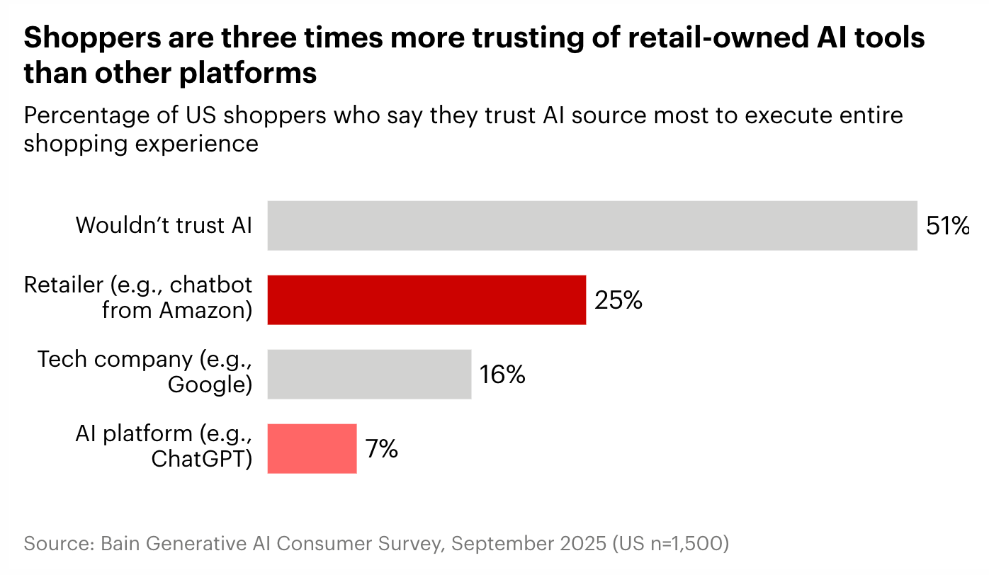 Gleichzeitig stellt sich damit aber auch erneut die Frage, ob die AI-Chatbots mit ihren aktuellen Fähigkeiten je über bloße Kaufempfehlungen hinauskommen werden. Eine Frage, die ich mir hier bereits vor ein paar Wochen gestellt habe. Abgesehen von der technischen Machbarkeit ist aber ebenso wichtig, ob Käufer überhaupt AI beim Shoppen vertrauen würden. Und wenn ja, wessen AI? Die Antworten aus Bain & Companys neuester Konsumenten-Umfrage aus dem September sind teilweise überraschend: